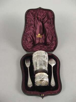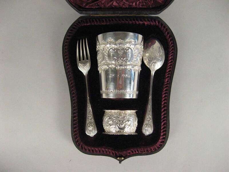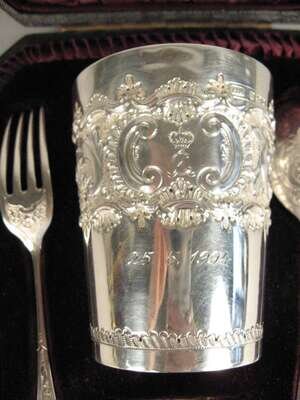 Comprising a cup, napkin ring, fork and spoon, the cup monogrammed CA beneath a crown and dated 25.5.1994, in a fitted leather case marked R. L. Rennison, Silversmith, Sunderland.