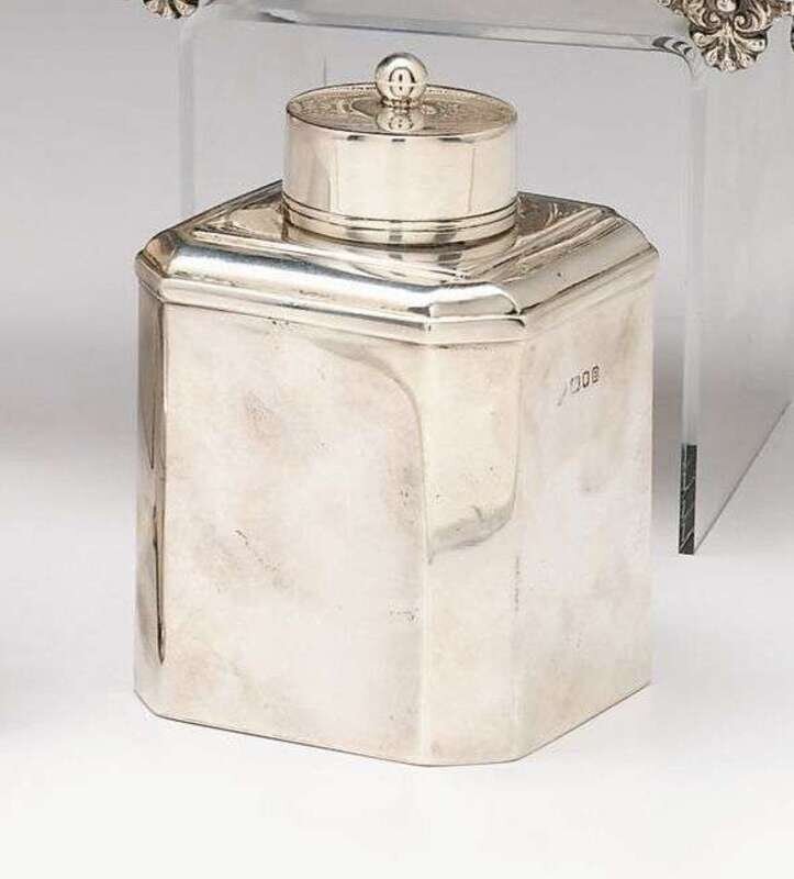 Retailed by Goldsmiths & Silversmiths Co., of canted square form with a cylindrical cover and ball knop.