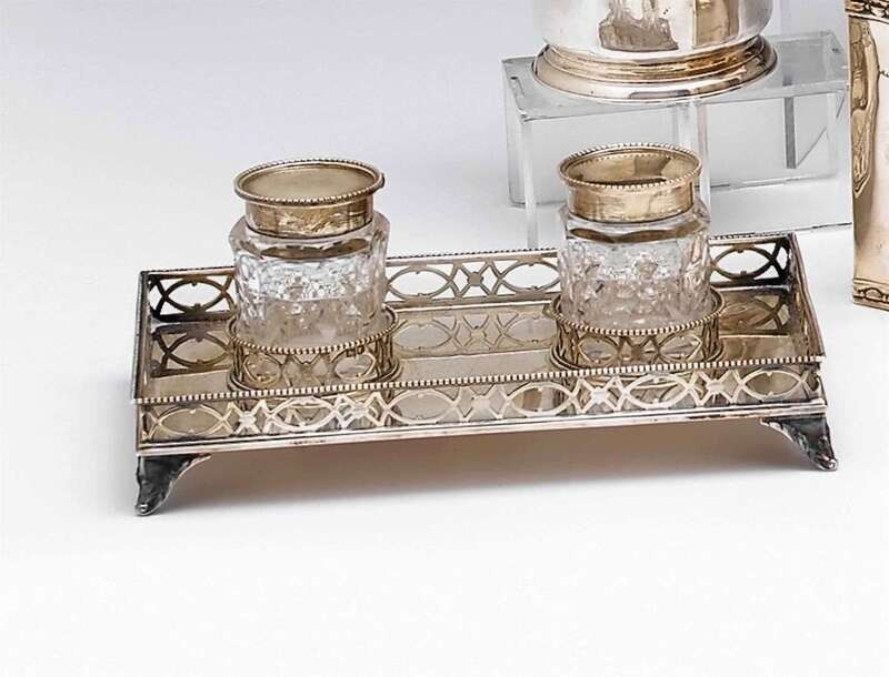 The rectangular tray with a pierced gallery rail with beaded edge, containing two faceted glass inkpots with sterling covers with beaded edges, raised on outscrolling feet, the underside with a release pin for cleaning.