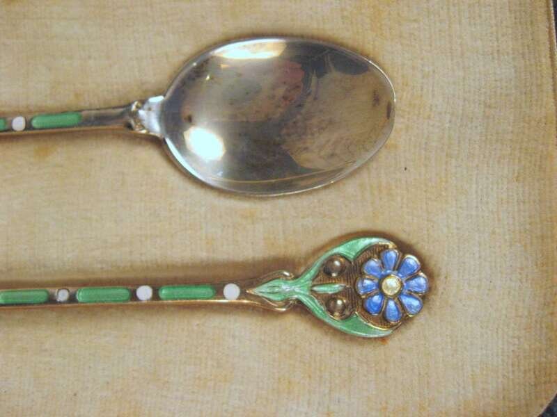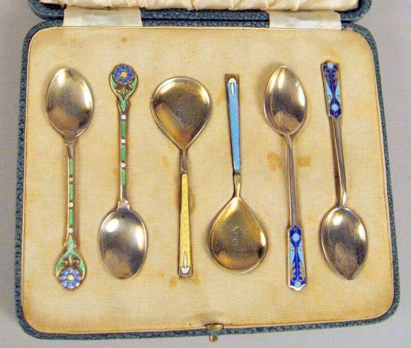 Boxed set of six sterling silver and polychrome enameled spoons turner & simpson, birmingham, early 20th century