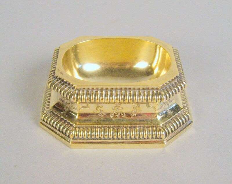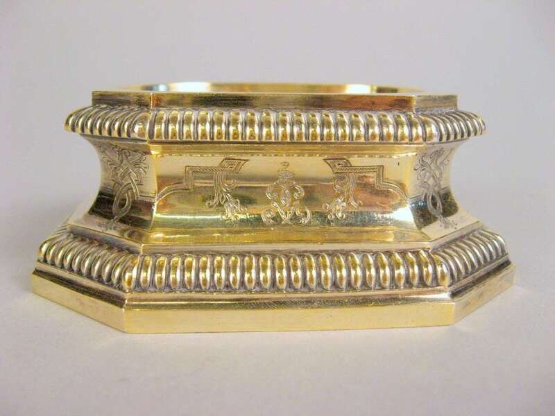 With a deep bowl and gadrooned rim, etched strapwork decoration to the sides.