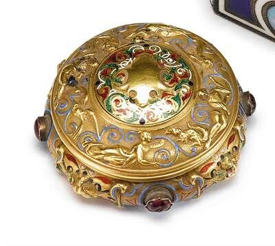The cover with a relief band of reclining classical maidens and exotic animal centered by a vacant cartouche with enamel scrolling decoration, the body with floral swag reliefs separated by mounted amethyst cabochons and a foliate scroll engraved underside.