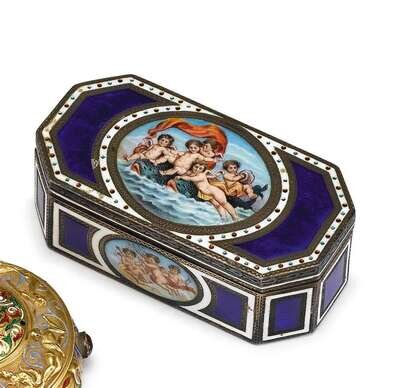 The rectangular box with canted corners, the cover centered by an enameled oval plaque depicting cupids riding dolphins, with cobalt guilloche and colored glass 'jewel' banded outer sections, the sides and bottom similarly decorated, with a gilt wash interior.