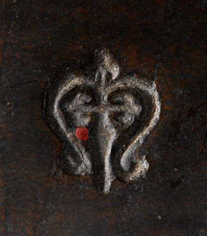 Probably Northern European, the standard carved with putti above four candle arms carved as reclining male nude figures, unknown maker's mark to the corona.