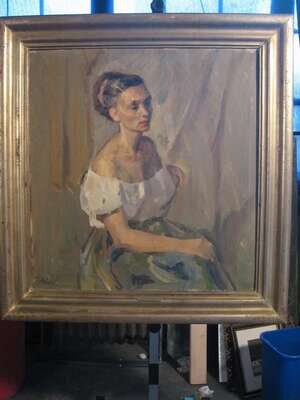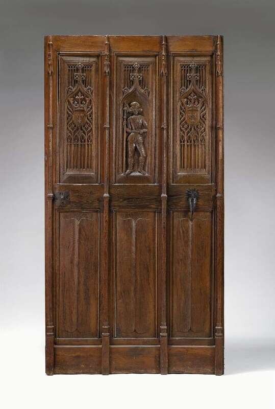 The paneled door with Gothic heraldic shields centered by a carved figure above carved linen folds, the reverse carved with linen fold panels.