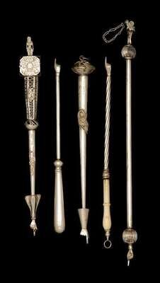 Comprising two Russian silver examples, marked 84; one example marked 800; one with a turned ivory handle; and one unmarked. (5).