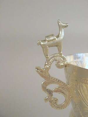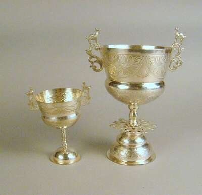 The embossed bowls with applied S-scroll handles surmounted by llamas, above central shaped stem supports, the larger example with a pierced hand hold, raised on domed bases. (2).