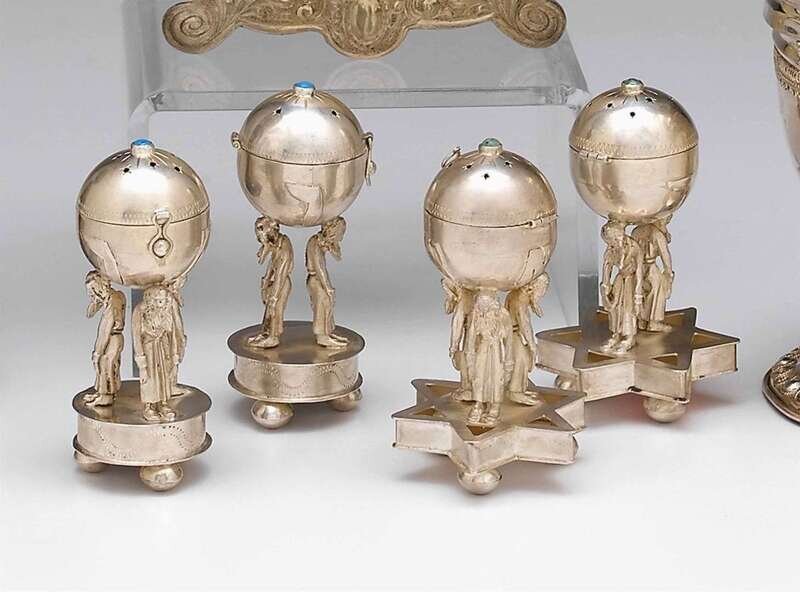 Both bearing date marks to 1894, consisting of a hinged sphere with a pierced cover mounted with a semi-precious stone, supported on three stooped figures of elders, one set raised on a circular base with ball feet, the other on star-shaped bases on ball feet. (4).