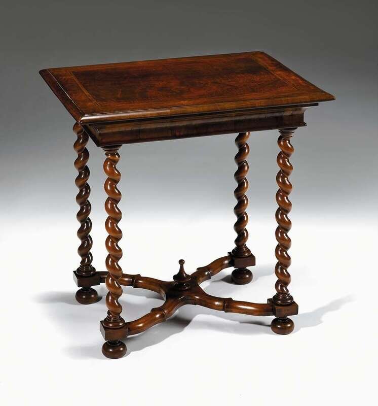 The rectangular top with a molded edge raised on barley twist supports, joined by an x-form stretcher ending in bun feet.