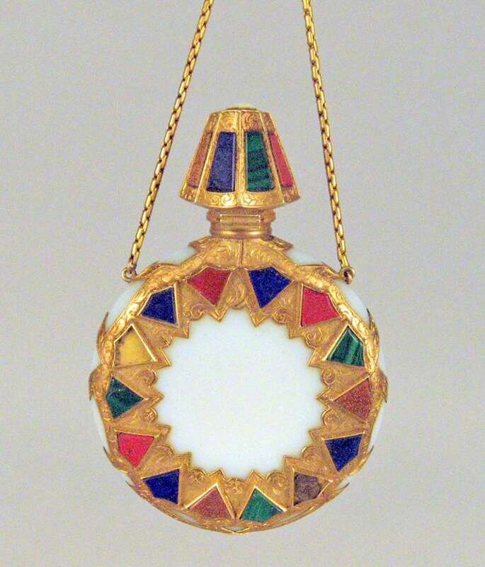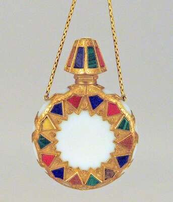 The circular opaline body mounted with gilt metal and mounted with various hardstones, and a hinged faceted lid, with a gilt hanging chain.