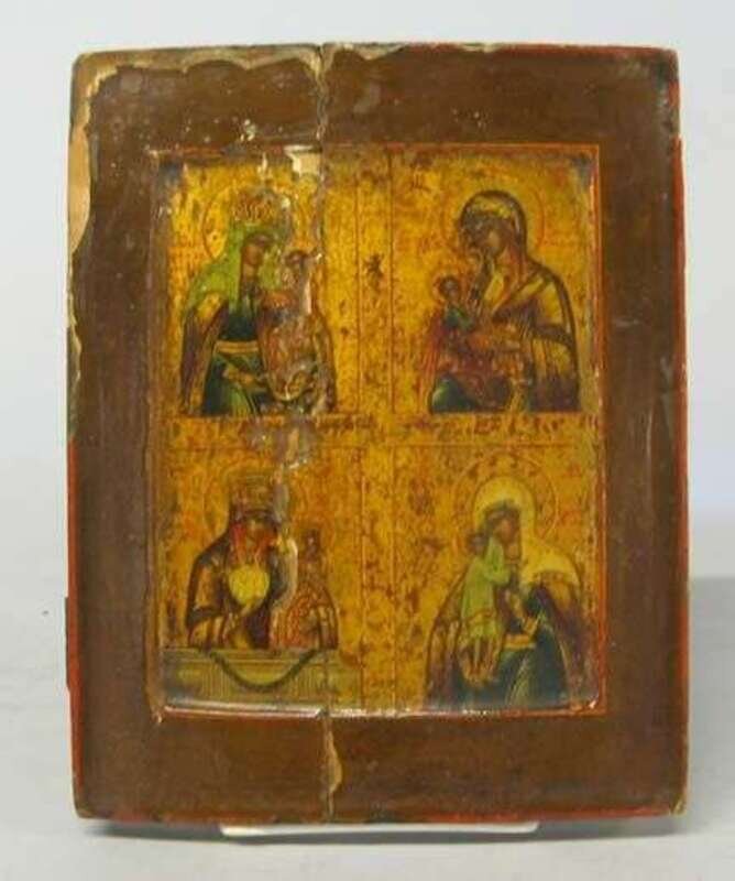 The panel divided into quarters, each representing a different image of the Madonna and Christ, on a gilt enhanced ground.