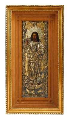 The full figure image of Christ ornately robed holding an orb, in a repousse and silver gilt oklad, stamped 84, in a modern frame.
