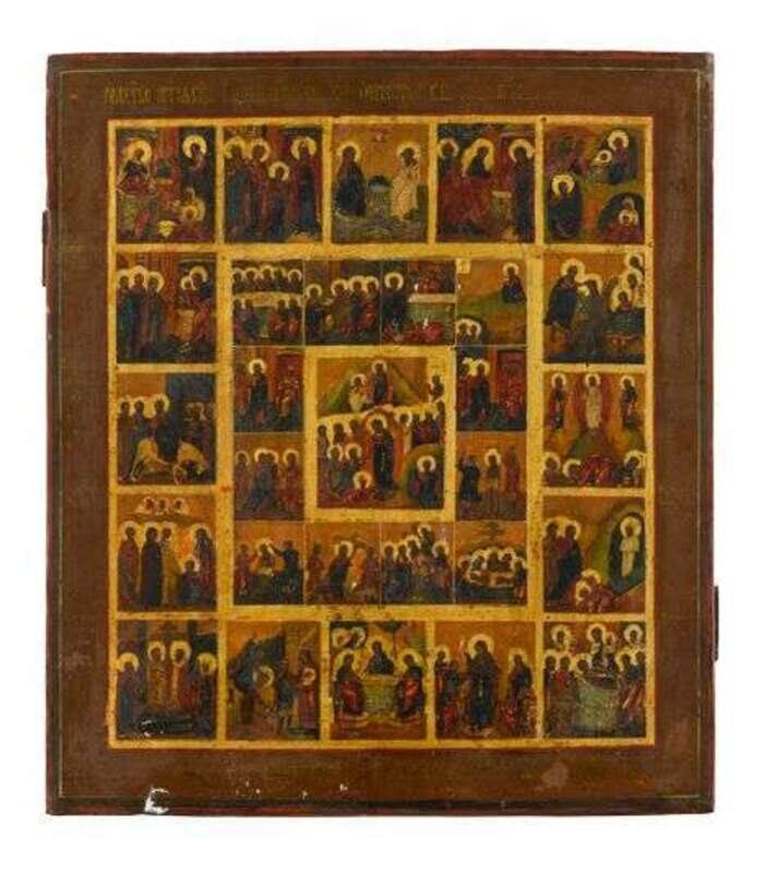 Russian icon of the Anastasis with the Passion and main Ecclesiastical Feasts 18th century