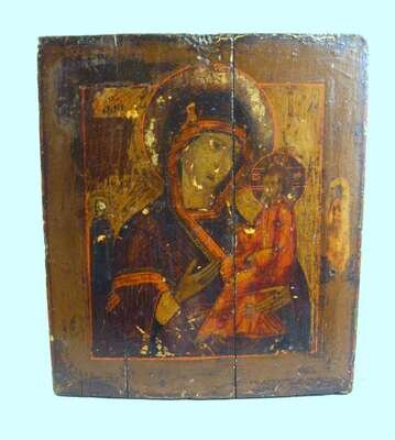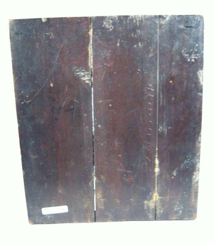With a standing figure of a saint to her right, with a further standing figure of a saint in the border.