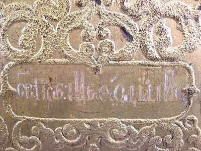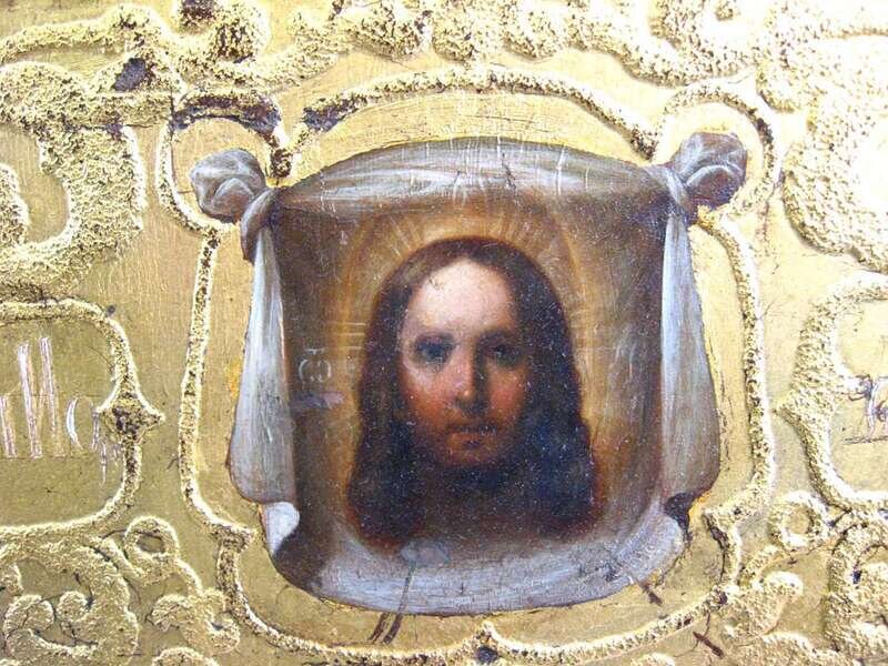 Depicting two saints standing beneath an image of the mandylion, against a raised and gilt scrolling ground.