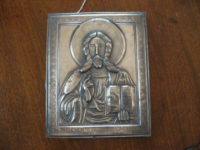 The all covering silver oklad depicting Christ with his right hand raised and holding a book in his left, stamped 84 with illegible assayer mark, mounted to a red velvet covered panel,.
