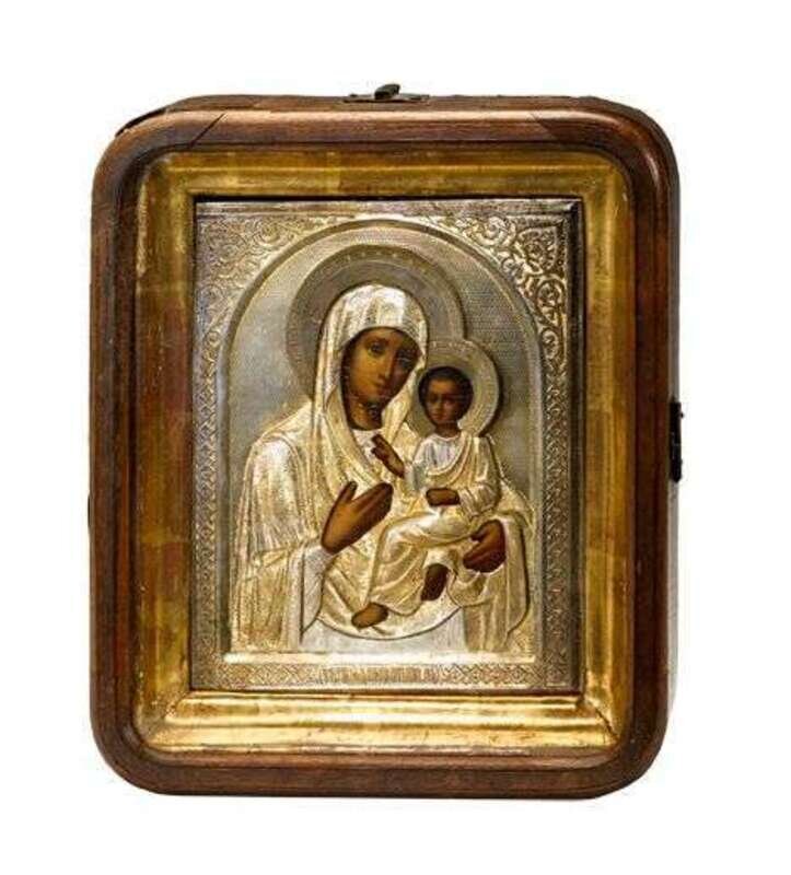 Depicting the Madonna and Christ, with a silver and silver-gilt chased oklad stamped 84 standard and with maker's and assay office marks, enclosed in a hinged and glazed case.