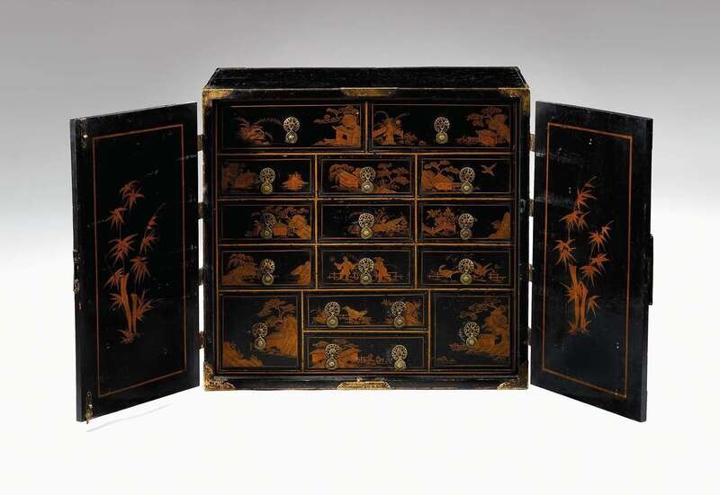 With a pair of cupboard doors decorated with a mountainous Chinese landscape opening to an interior fitted with an arrangement of drawers, each decorated independently with landscapes.