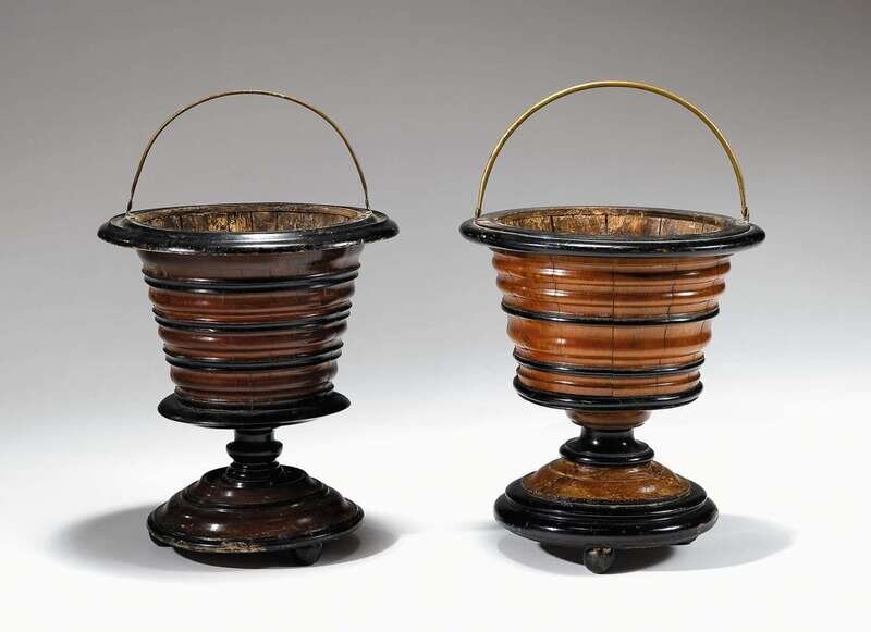 Each with a brass handle raised on a circular base and bun feet. (2).