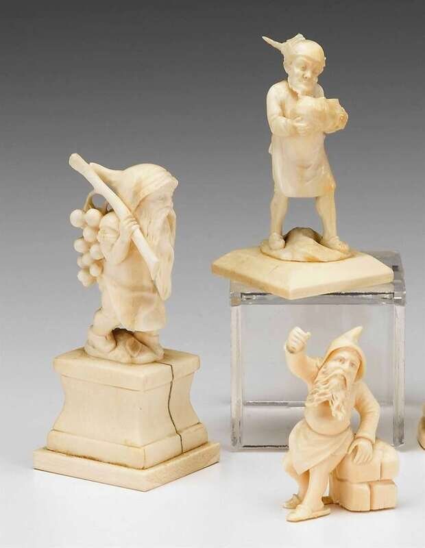 The larger example carries grapes over his shoulder, the next carries a snail shell, and the third raises his hand in the air while leaning against a wall. (3).