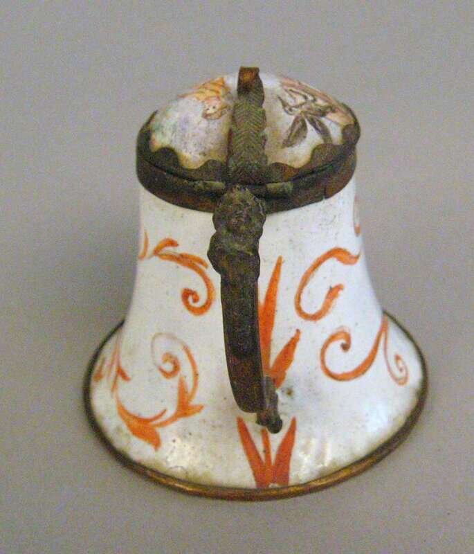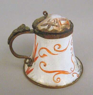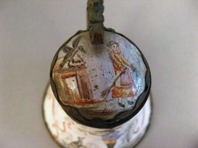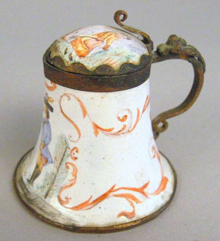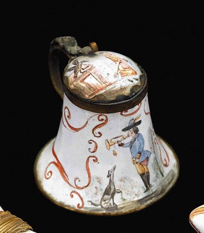 The bell-shape body decorated with a figure of a hound and gentleman blowing a horn, with a scroll metal handle.
