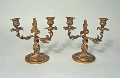Each with bearded mask spout and scrolling handle cast with a dolphin, the ovoid body decorated with a band of cartouches upon lion's mask supports, the circular foot decorated with alternating shields and fruit filled cornucopia. (2).