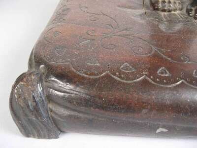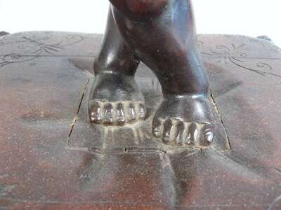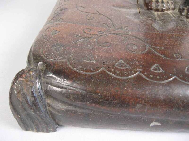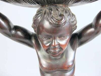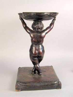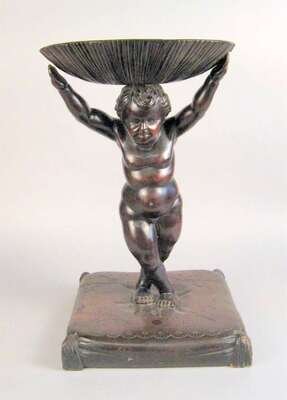 In the form of an infant supporting a shell raised on a tasseled cushion base.