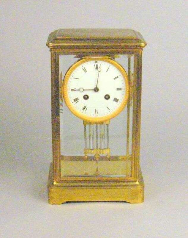 French brass and beveled glass mantel clock early 20th century, retailed by j.e. caldwell