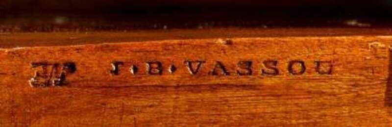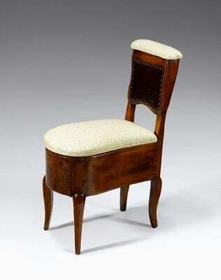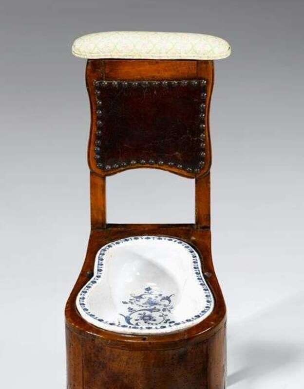 With a hinged padded toprail opening to a brass lined compartmentalized interior above a removeable padded seat revealing a shaped tin-glazed earthernware basin, with a wide apron raised on cabriole legs. NOTE: Jean-Baptiste Vassou, maitre 1767.