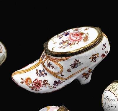 Modeled as a lady's shoe with upturned toe and high heel, decorated throughout with floral sprays on a white ground.