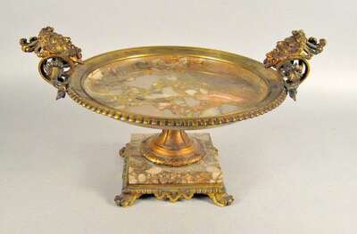 The circular dished top with a gadrooned rim and handles cast with Saytr masks, raised on socle cast with strapwork and bellflowers and a square base.