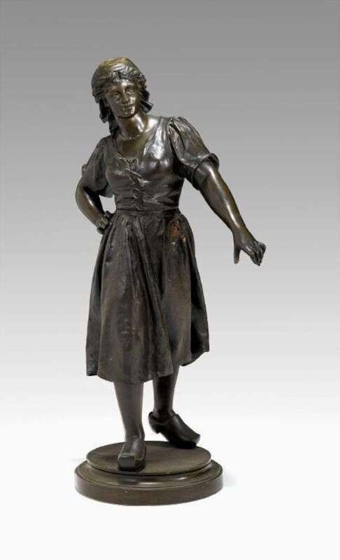 Bronze, medium brown patina, modeled as a woman standing and wearing wooden shoes, on a circular base.