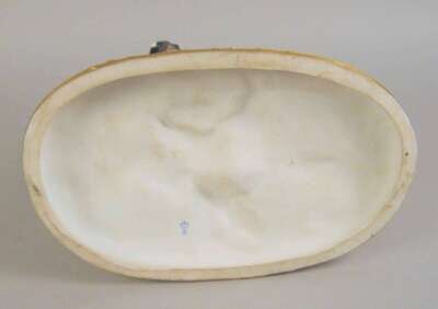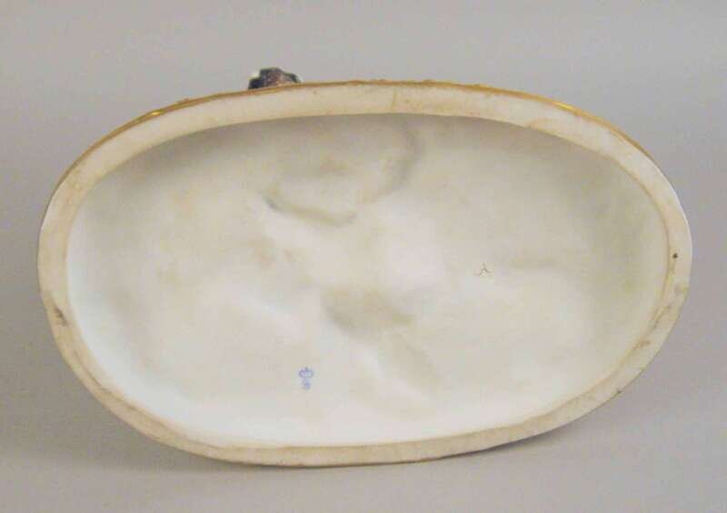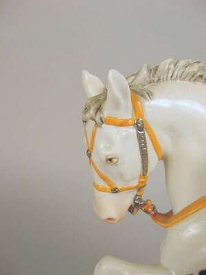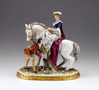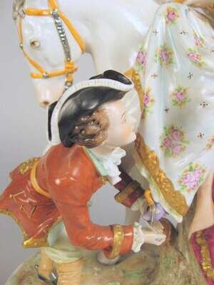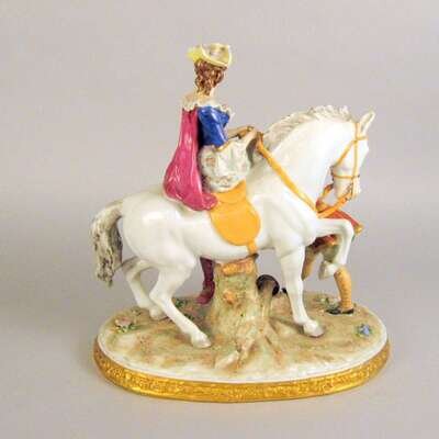 Modeled as a lady seated atop a white horse and attended by an admirer, a hunting horn on the ground, on an oval molded base with applied flower and gilt decoration, printed blue mark to underside.