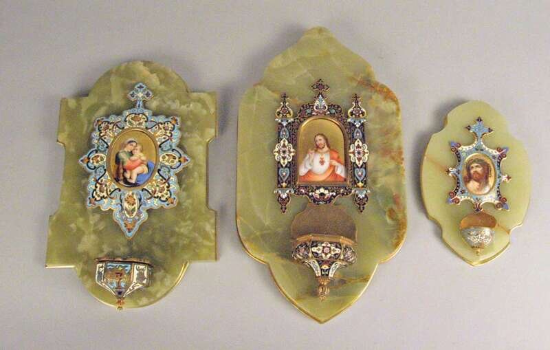 The shaped enameled plaques over separate enamel covered wells, the first depicting Christ and the Sacred Heart, one with Christ and the Crown of Thorns, and the final with the Madonna of the Chair after Raphael; all mounted on shaped green onyx back plates. (3).