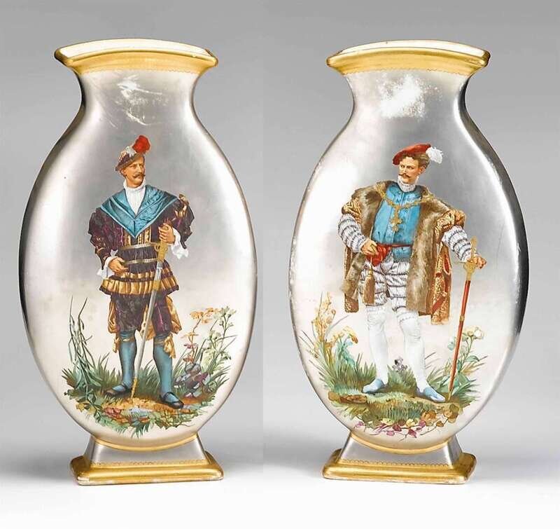 Of flattend oval form with flared mouths, decorated with figures of gentlemen in 16th century dress, armorial crests to the reverse, on a silvered ground with gilt details, retailer's stamp to underside. (2).