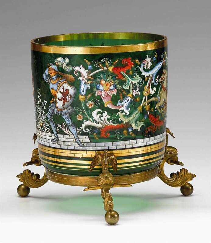 The green glass cylindrical body decorated in enamels with a continuous band depicting a pair of dueling knights, hippocamps, flowers and foliate scrolls and cornucopia, raised on a gilt metal tripod base with scrolling foliate feet surmounted by pelicans and fish.