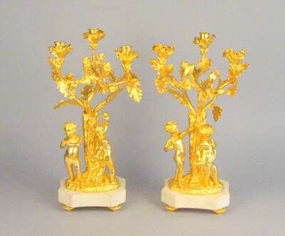 Each with two infants with musical instruments beneath a tree issuing three leafy voluted candlearms, re-gilt.