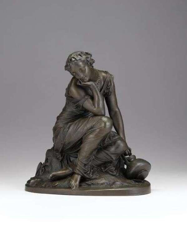 Bronze, greenish patina, modeled as a classical maiden kneeling by the water's edge, a vessel at her feet, signed Schoenewerk scpt, inscribed L. Marchand Edti.