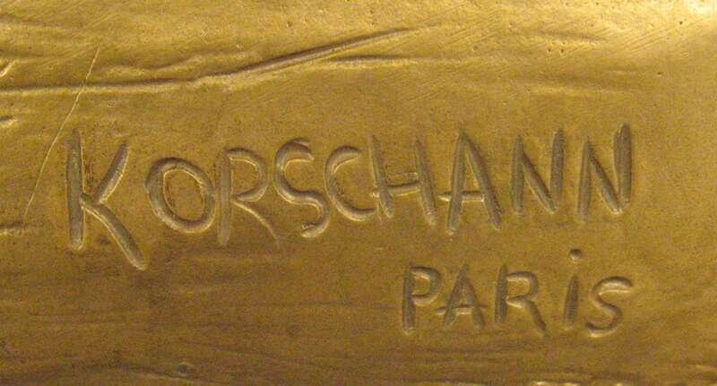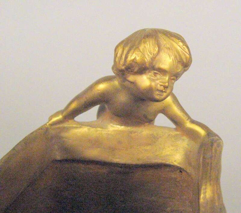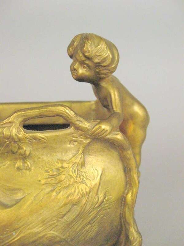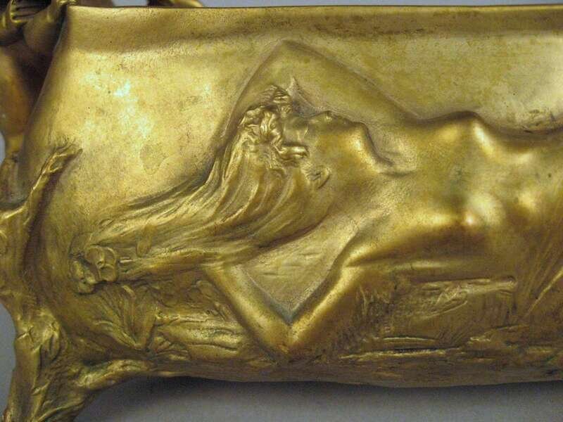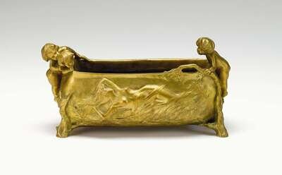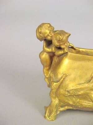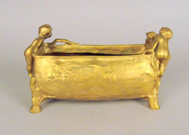Bronze jardiniere, gilt patina, the oblong bowl modeled with three putti peering over the top to a sleeping nude female cast in relief to the front, raised on branch form legs, signed Korschann/ Paris and stamped Louchet.