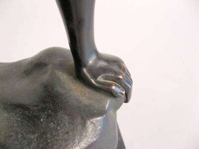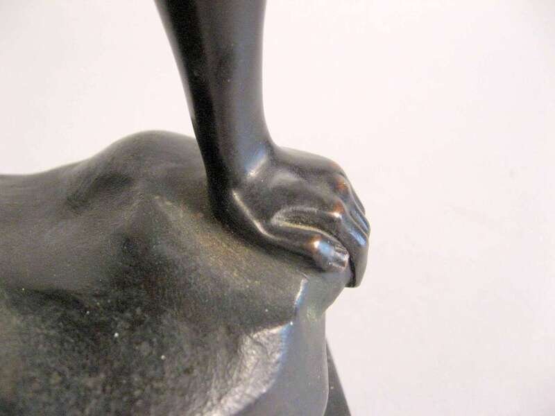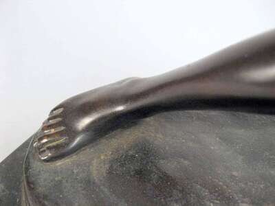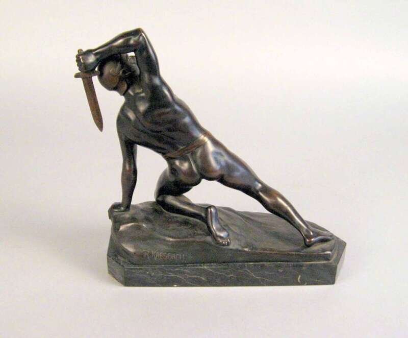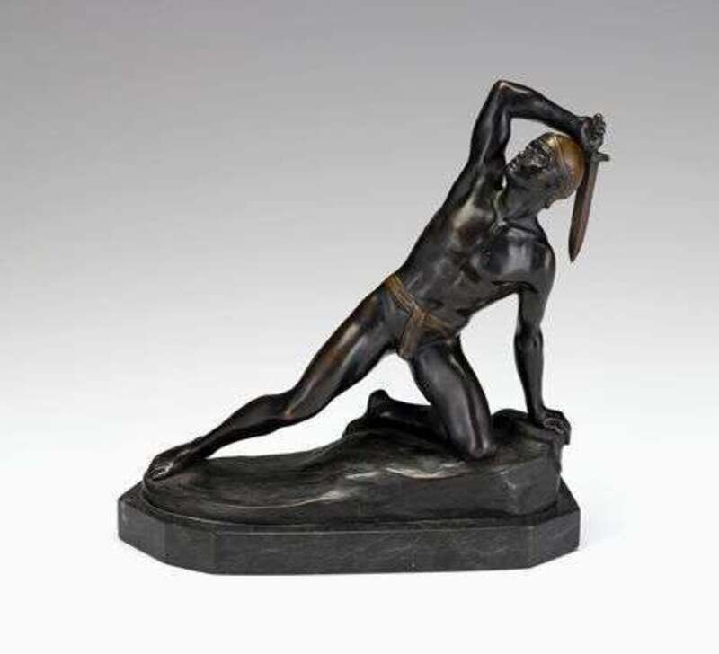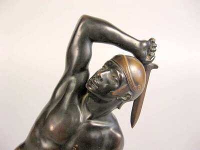 Dark brown patina, depicting a warrior defending himself, raised on a marble base.