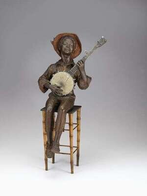Depicting a young black boy playing a banjo seated on a bamboo form stool, stool signed illegibly.