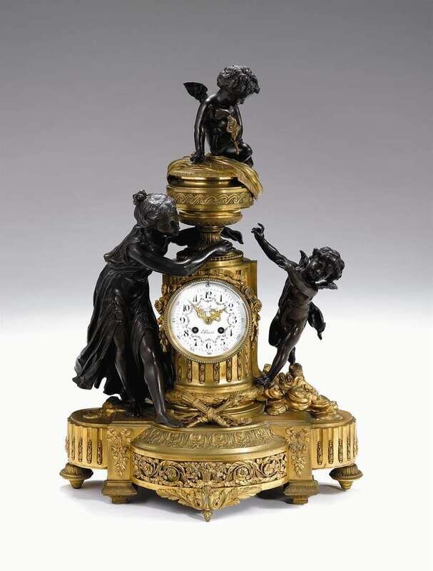 The circular enameled dial with Arabic numerals painted with floral garlands signed Eugne Bagues A Paris, the movement with an AD Mougin pastille set within a ribbon tied columnar case surmounted by an urn form finial, a winged putti seated above with a flanking classical maiden and winged putti atop a cloud bank, raised on a shaped base cast with leaf tips and ending scrolled feet.