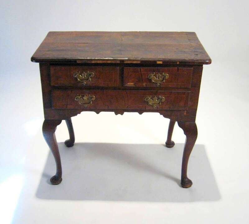 The crossbanded and molded edge top over two short and one long drawer above a shaped apron and raised on cabriole legs ending on pad feet.