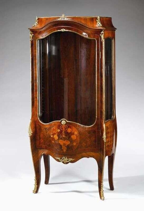 Louis XV style gilt bronze mounted rosewood parquetry and marquetry vitrine