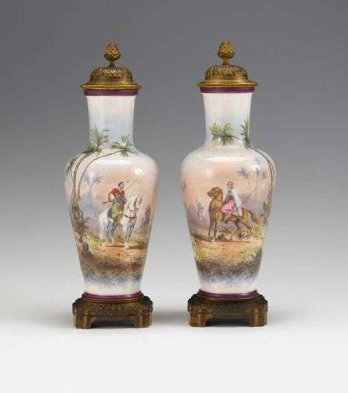 Each of baluster form with a domed lid and berry finial, decorated with equestrian Arabian landscapes. (2).