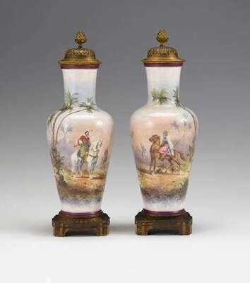 Pair of Sevres style gilt bronze mounted porcelain covered urns late 19th century, j. deschamps
