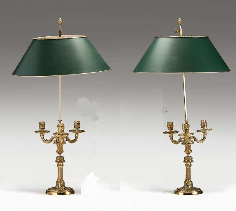 Now mounted as bouillotte lamps, each with three curved leaf-cast candle arms with leaf-tied drip-pans and fluted bobeches, the central standard cast with entrelac and beading, raised on a circular fluted foot. (2).