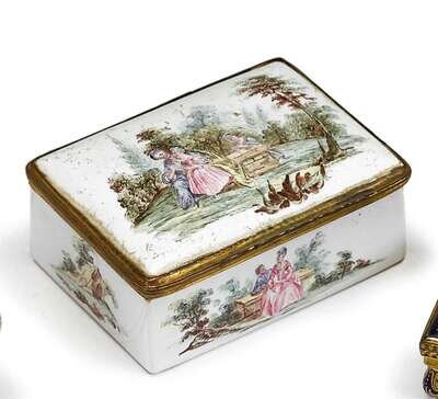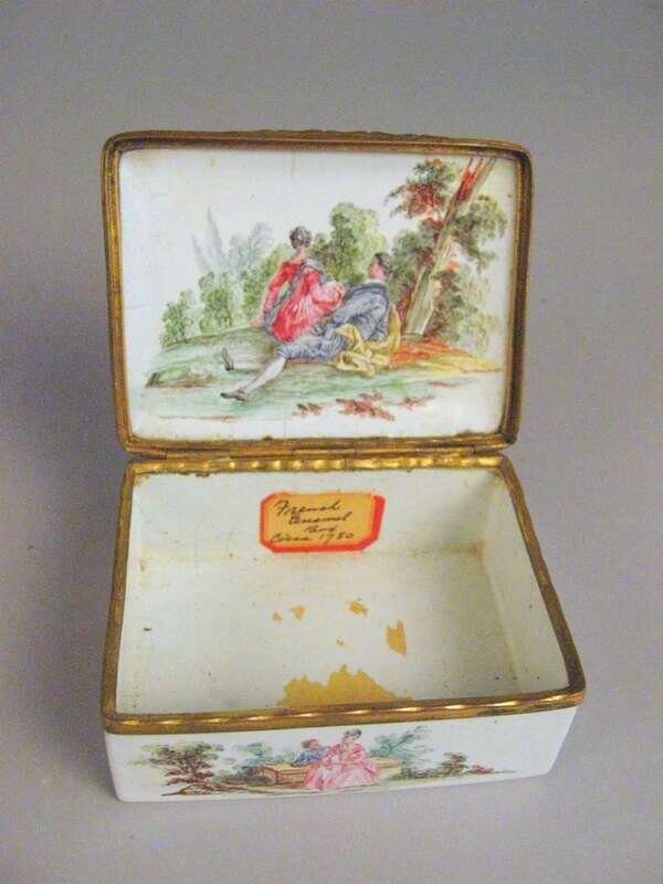The rectangular box with a cushion lid, decorated with scenes of lovers' trysts and garden views.