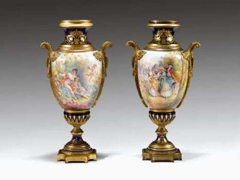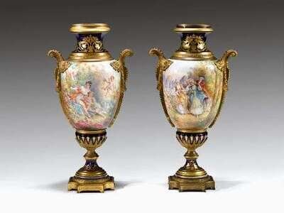 Pair of Sevres style gilt bronze mounted urns signed ch(arles) fuchs