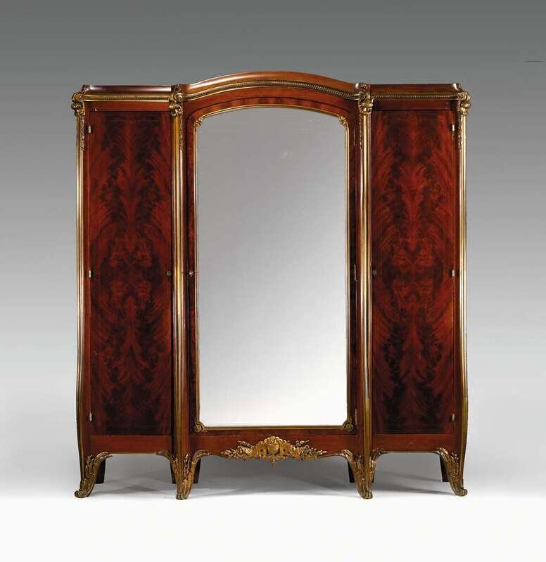 Large Louis XV style gilt bronze mounted mahogany armoire circa 1900, stamped forest